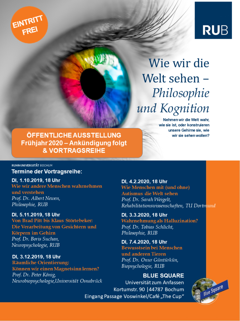 Die Vortragsreihe „Wie wir die Welt sehen – Philosophie und Kognition“ startet am 1. Oktober 2019 um 18 Uhr im Blue Square, Kortumstraße 90, 44787 Bochum. Der Eintritt ist frei, eine Anmeldung nicht erforderlich. Danach gibt es jeweils am ersten Dienstag eines Monats einen Vortrag zu einem anderen Aspekt der Wahrnehmung.