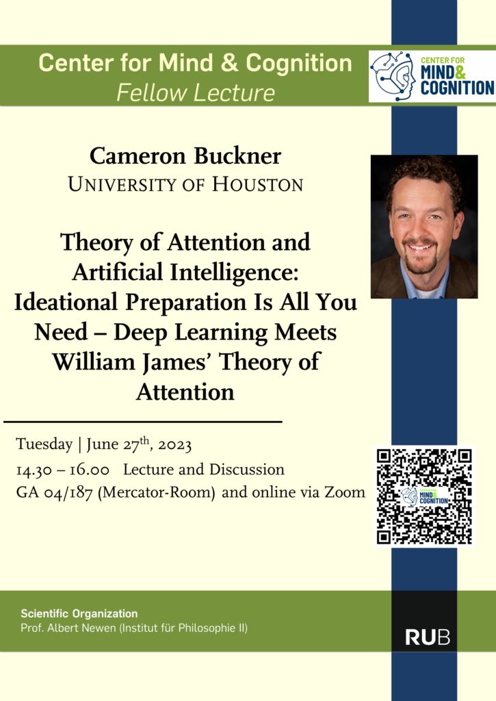 architectures with multiple interacting faculty modules. In this talk, I focus on William James’ account of attention in the Principles of Psychology by comparing the roles he assigned to attention in the extraction of abstract knowledge from experience to the innovations behind many recent architectures in deep learning. Despite numerous alignments, I argue that deep learning still has much to gain by considering other aspects of James’ theory which have not yet been fully implemented, especially the “ideational preparation” component of his theory, which aligns more naturally with predictive processing accounts of cognition.